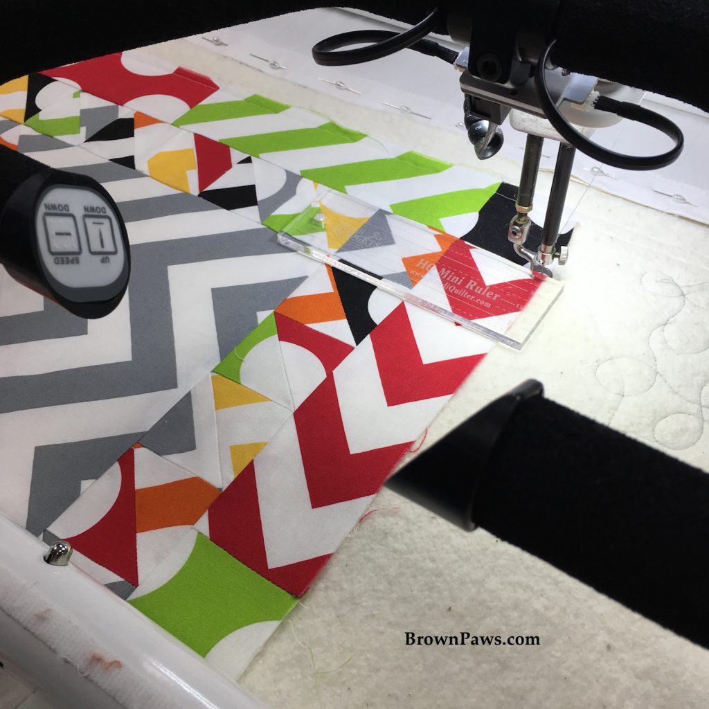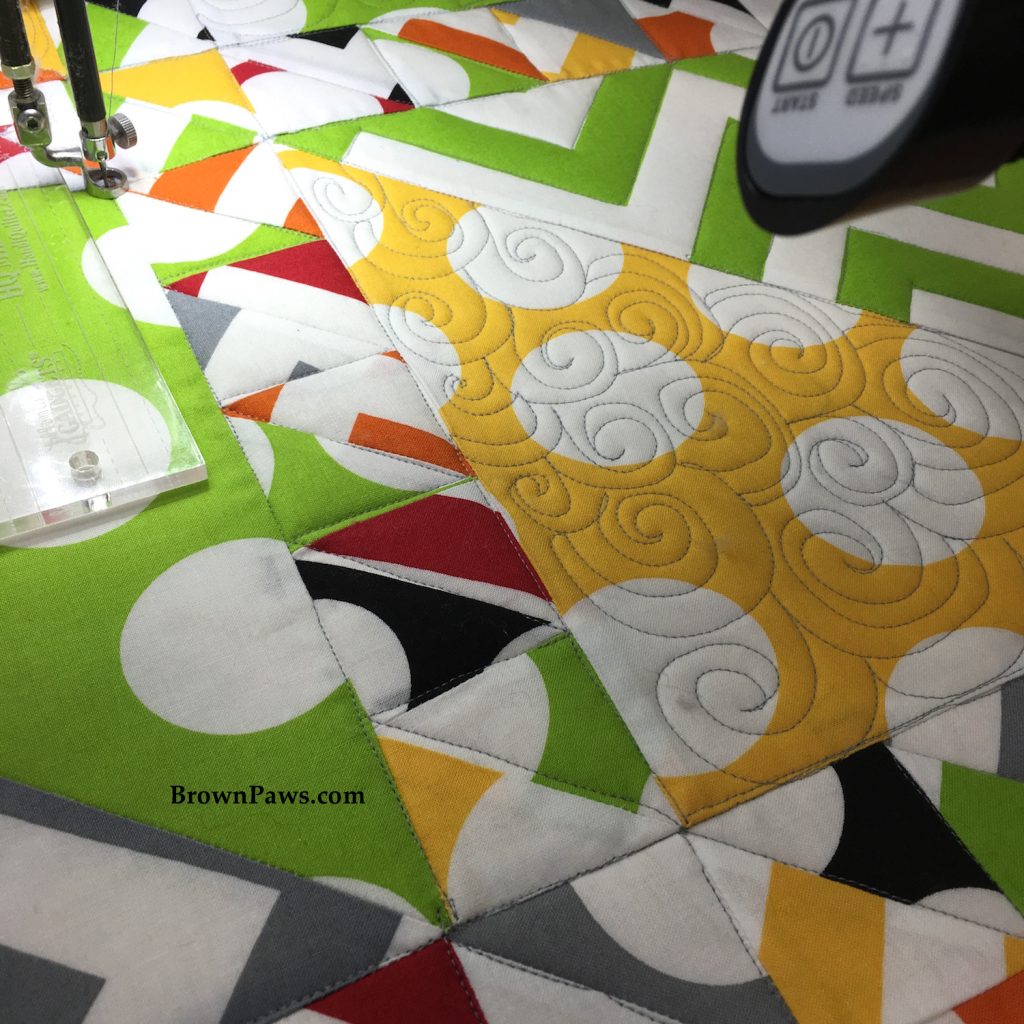This time I wanted to outline all of the blocks (stitch in the ditch) because I didn’t do that on the first one and I didn’t like how that turned out. I outlined all the HSTs in the sashing, did switchbacks in the outer border, outlined the zig-zags in one half of the HSTs and did swirls in the other half. I really wanted to try swirls on the long arm as I do a lot of them in my domestic machine quilting, so I wanted to compare the process and the outcome.